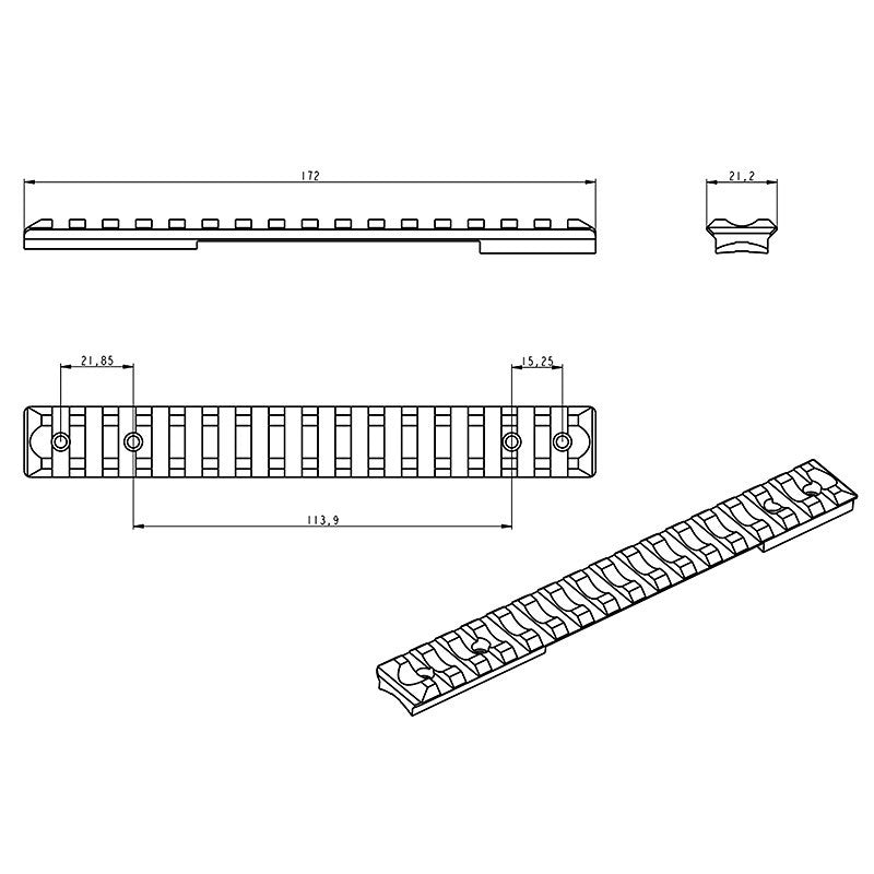 Picatinny bėgelis (bazė), skirtas montuoti optikos žiedus su Picatinny standartu.